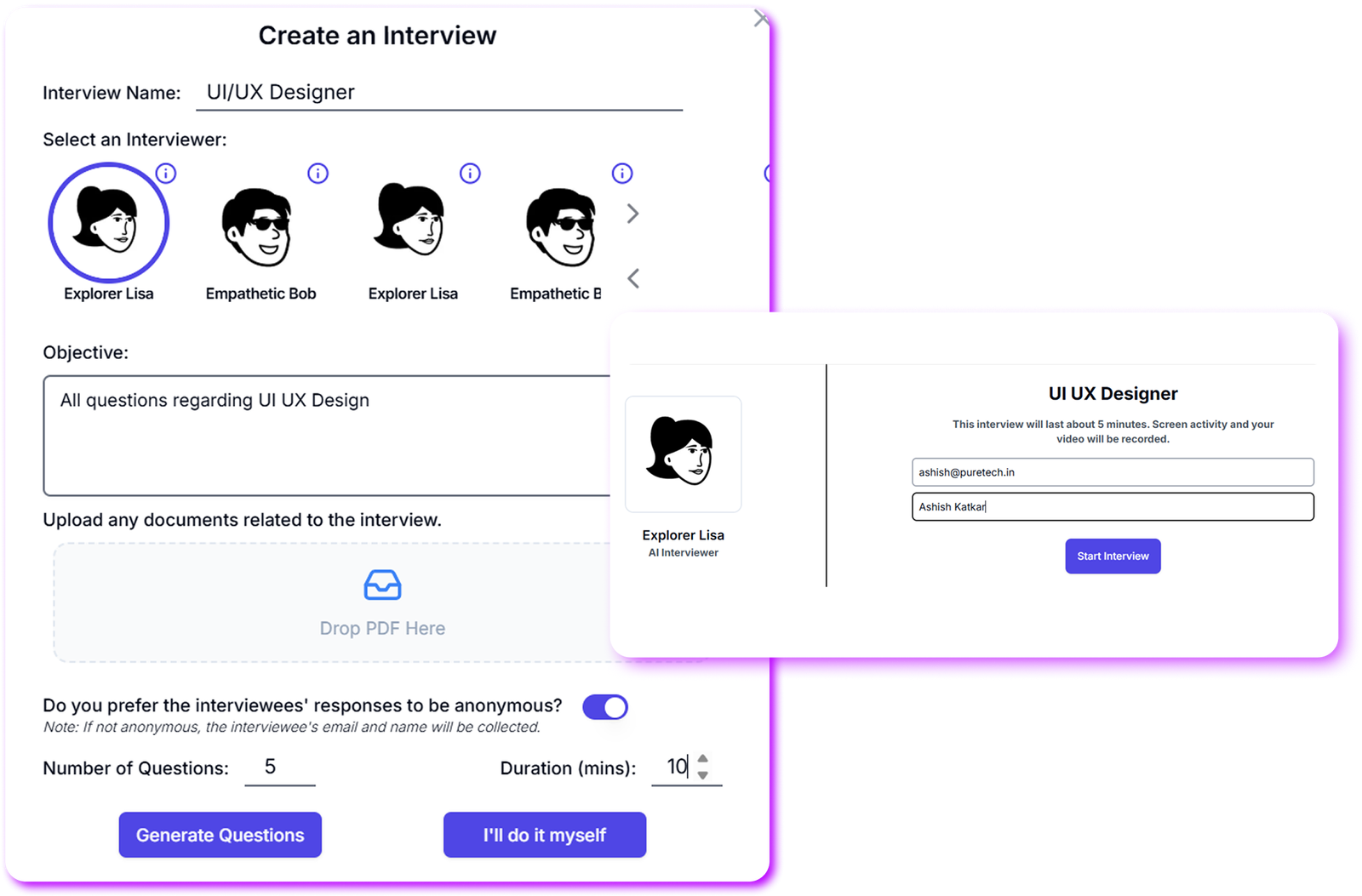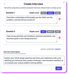 Upload the Job Description and any interview requirement documents. Questa’s AI understands the objective and scope — from role expectations to desired skill sets — to craft a focused, intelligent interview.
