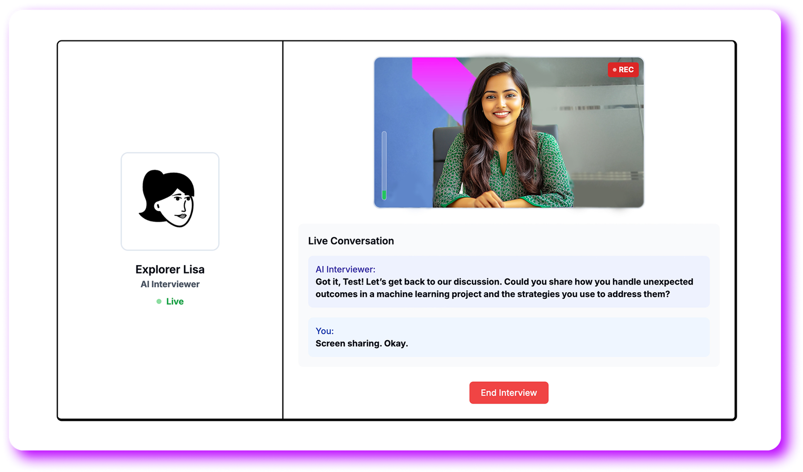 Track your speaking clarity, tone, filler words, and pace with live insights during your mock interview.